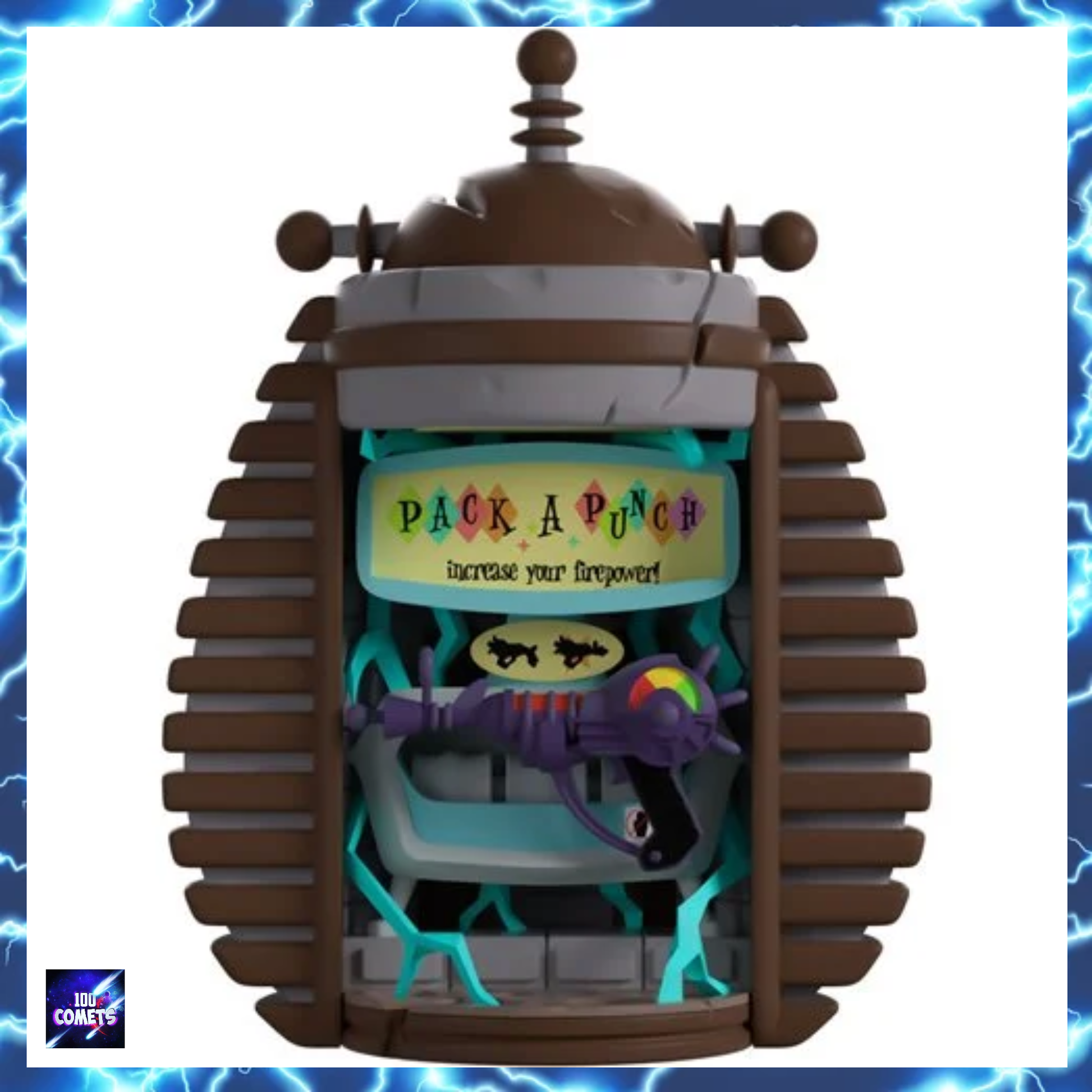 Howdy partner! You look like you're in need of an upgrade! Well you've come to the right place as Youtooz is here to help you Pack just the Punch you need! At almost 5 1/2-inches tall, its egg-shaped silhouette is covered in horizontal wooden beams as a trio of antennas stick out from the top ready to channel in all the power needed for a perfect upgrade, while at its center of sparks and streaks of blue lightning, sits a freshly powered up purple raygun, ready to grab and continue your fight for survival! The exterior of the packaging shows a Pack-A-Punch machine with bright blue electricity shooting out from the top, while the interior is pitch black covered in a vibrant red blood spray. The protective sleeve sees a beaten-up wood panelling with red notches marked in it as the figure can be seen through the large clear window at the packaging's front.