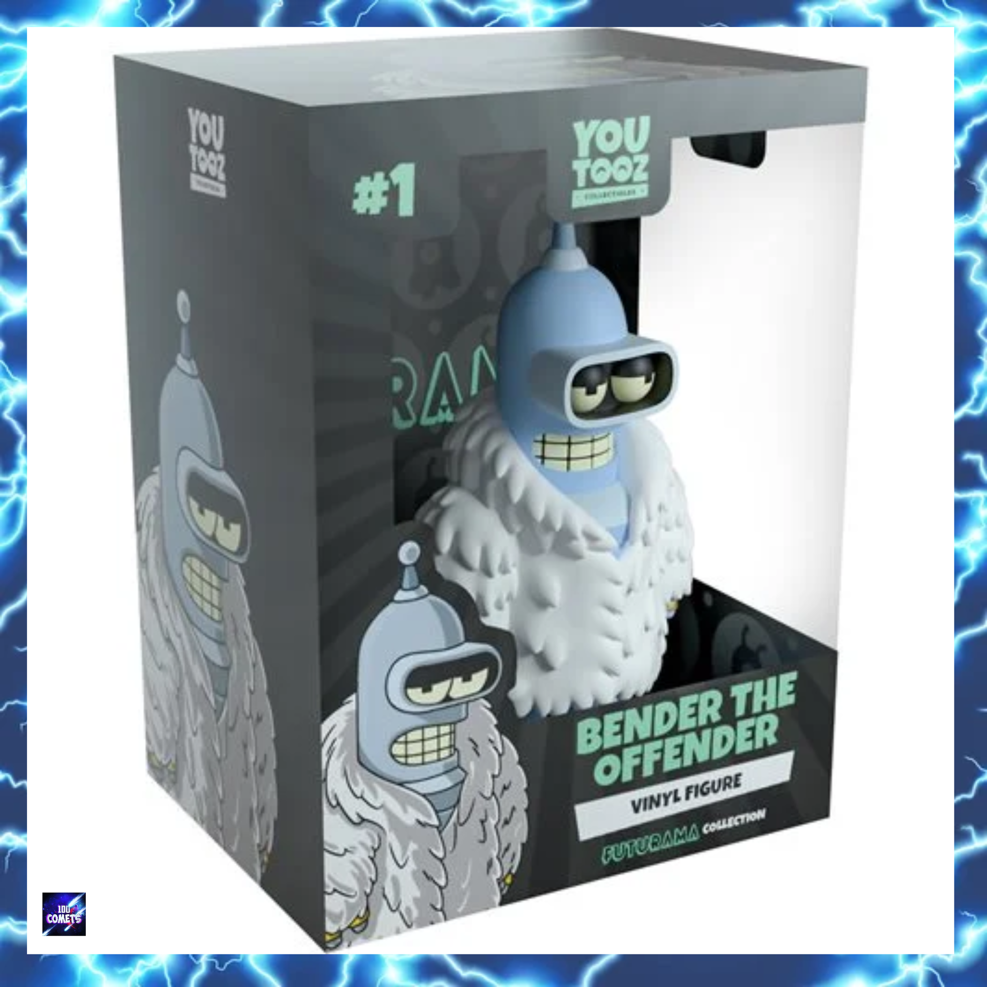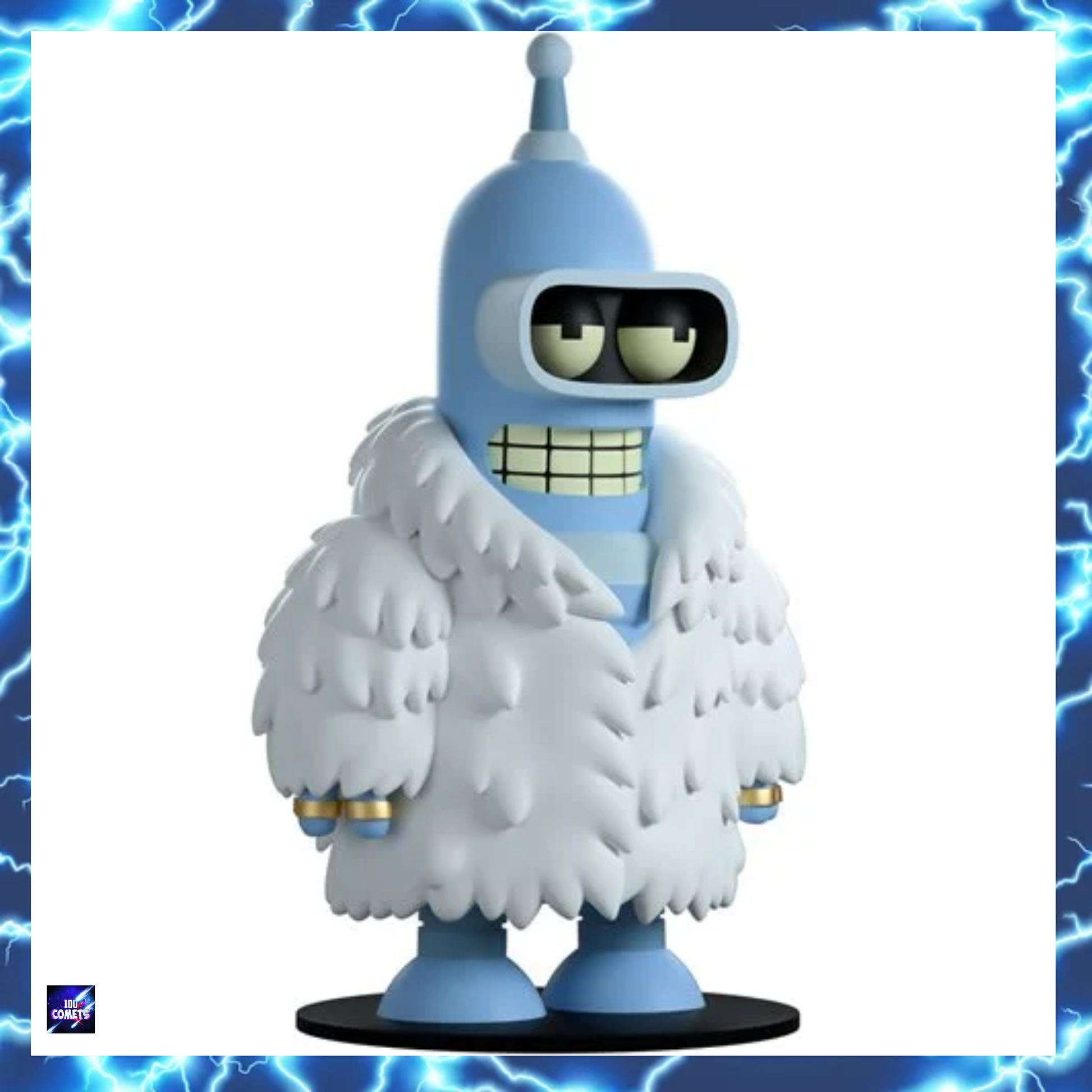 Bender the Offender, and ultimate robot lover, has stepped out of the ring and straight into Youtooz for his shiny metal debut! Standing at almost 5 1/2-inches tall with a somehow smug smile crossing his electronic mouth and half lidded eyes peering out from the visor attached to the front of his blue head, a short antennae raises up to a round point as he wears an oversized white feathered coat that covers his torso only revealing his gold ringed fingers and semi-ovoid feet. The exterior of his packaging sees a vibrant set colorful of pop-art squares showcasing the cast of the show, while the interior is a repeating circle pattern of black and grey brain slugs as light impact lines streak their way over the black protective sleeve, perfectly showing off his figure through the large clear display window at its front.